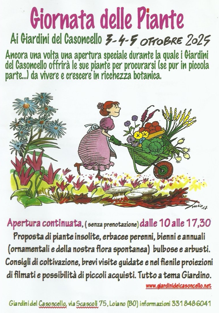 Dopo la felice conclusione delle Giornate delle Piante i Giardini del Casoncello continuano a proporre, per i mesi di ottobre e novembre ( ideali per la piantumazione ), erbacee perenni e arbusti insoliti. Previa telefonata allo 051 928100 o al 331 8486041. Vi aspettiamo!