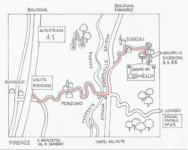 Se venite da Bologna, la strada più agevole e veloce risulta la Fondovalle Savena, deviando a destra prima di Rastignano, sul ponte del Savena, e Proseguendo poi in direzione Loiano, facendo attenzione subito dopo le Gole di Scascoli (rocce a strapiombo della strada), a deviare a sinistra per Scascoli , ulteriore segnalazione “Giardini del Casoncello” e proseguendo poi sempre diritti in direzione Loiano si giungerà ai Giardini del Casoncello.