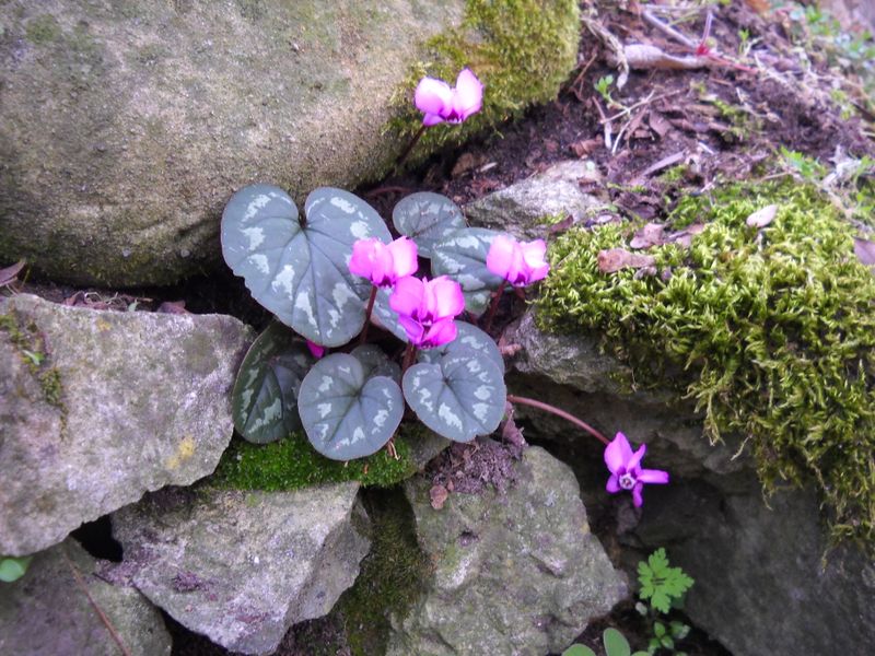 Nel Giardino della casa che non c’è, inaspettatamente, una piantina di Cyclamen coum è migrata fra i sassi del vecchio muro.