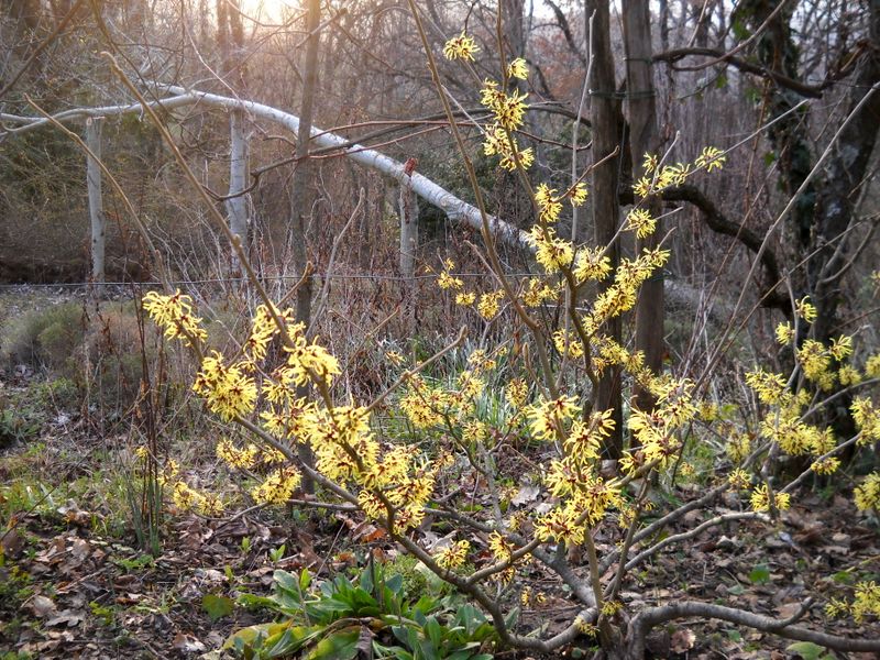Fra i rami fioriti di Hamamelis intermedia ‘Arnold Promise’ si intravede, sullo sfondo, il ”recupero” del pioppo divelto dalla nevicata dello scorso anno