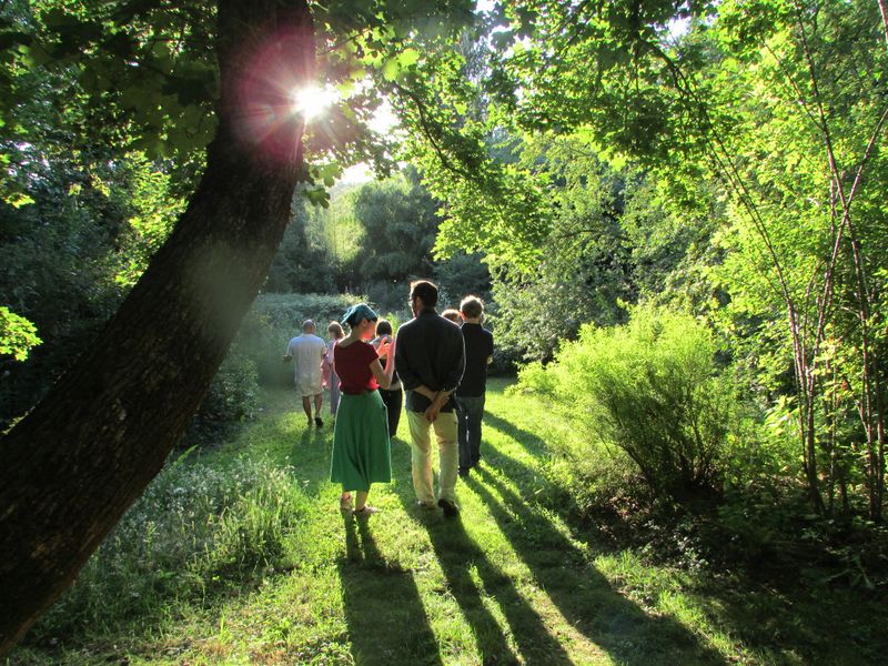 Nella luce dorata del tramonto il piccolo gruppo dei partecipanti alla visita speciale che si concluderà con la passeggiata notturna per incontrare le lucciole.