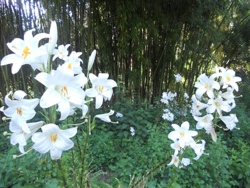 Nell’ ORTO GIARDINO i bambù creano lo sfondo per la fioritura di Lilium candidum… Ortica e melissa a contorno.