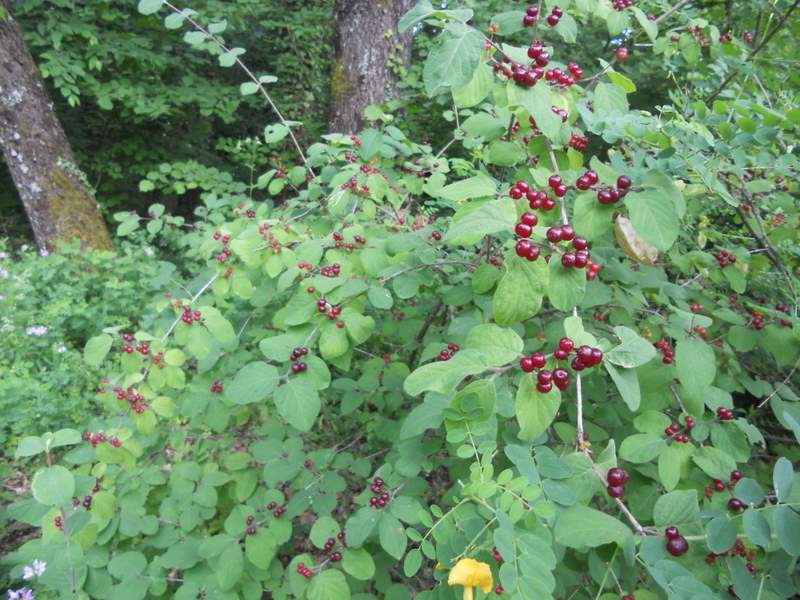 Lonicera xylosteum, finita la fioritura, offre ora il decoro delle sue piccole bacche color granato.