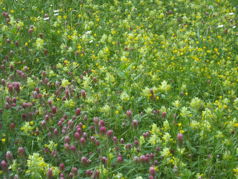 Rhinanthus minor si è finalmente installato in mezzo a Trifolium incarnatum del prato di ROSAQUERCIA…