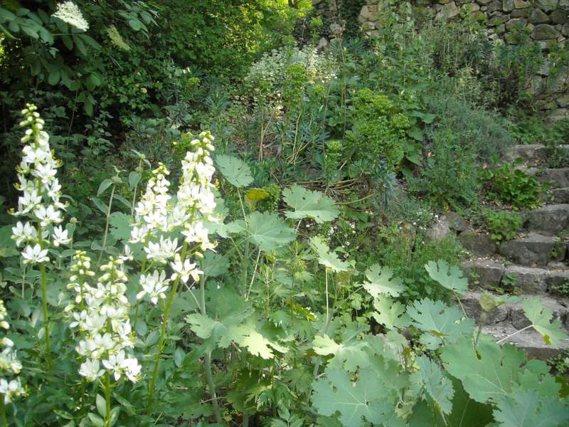 Nel GIARDINO DELLE ERBE ancora il dittamo, nella forma “Albiflora”, insieme a Macleaya cordata all’inizio della sua crescita.