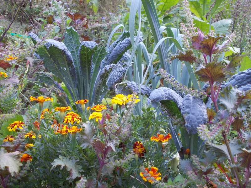 …e si mescola allegramente agli ortaggi e agli immancabili Tageti.