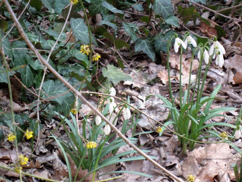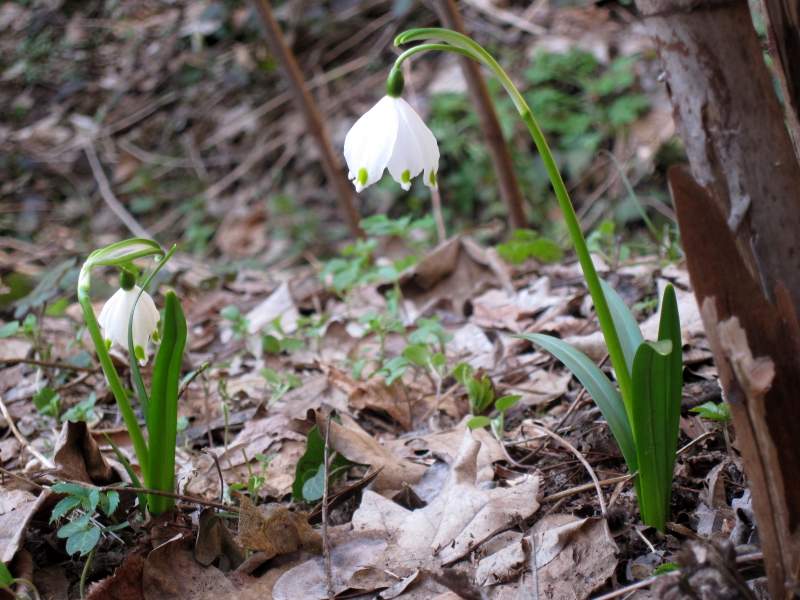 …non lontano, Leucojum vernum offre la grazia sottile dei suoi fiori campanulati.